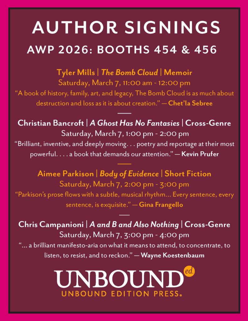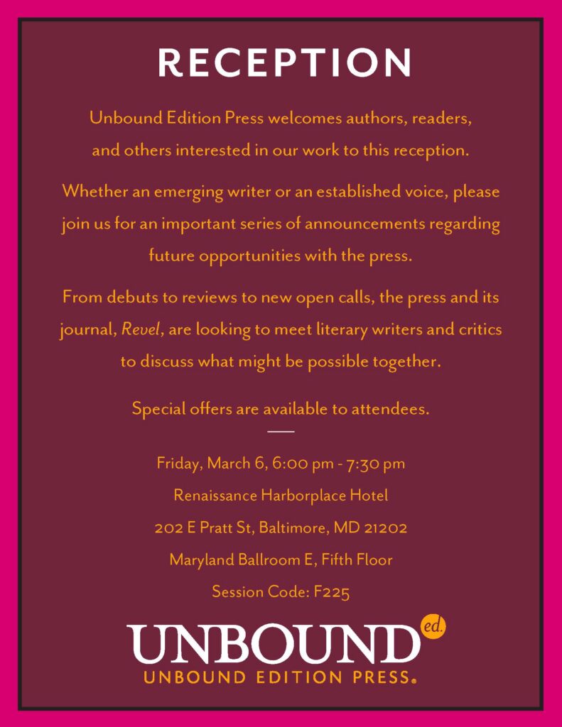 Join Unbound Edition Press authors at the readings, panels, or receptions scheduled below.