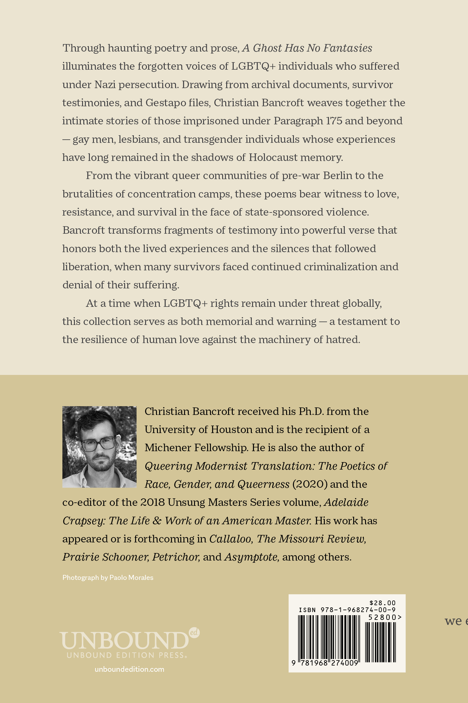Through haunting poetry and prose, A Ghost Has No Fantasies illuminates the forgotten voices of LGBTQ+ individuals who suffered under Nazi persecution. Drawing from archival documents, survivor testimonies, and Gestapo files, Christian Bancroft weaves together the intimate stories of those imprisoned under Paragraph 175 and beyond — gay men, lesbians, and transgender individuals whose experiences have long remained in the shadows of Holocaust memory.