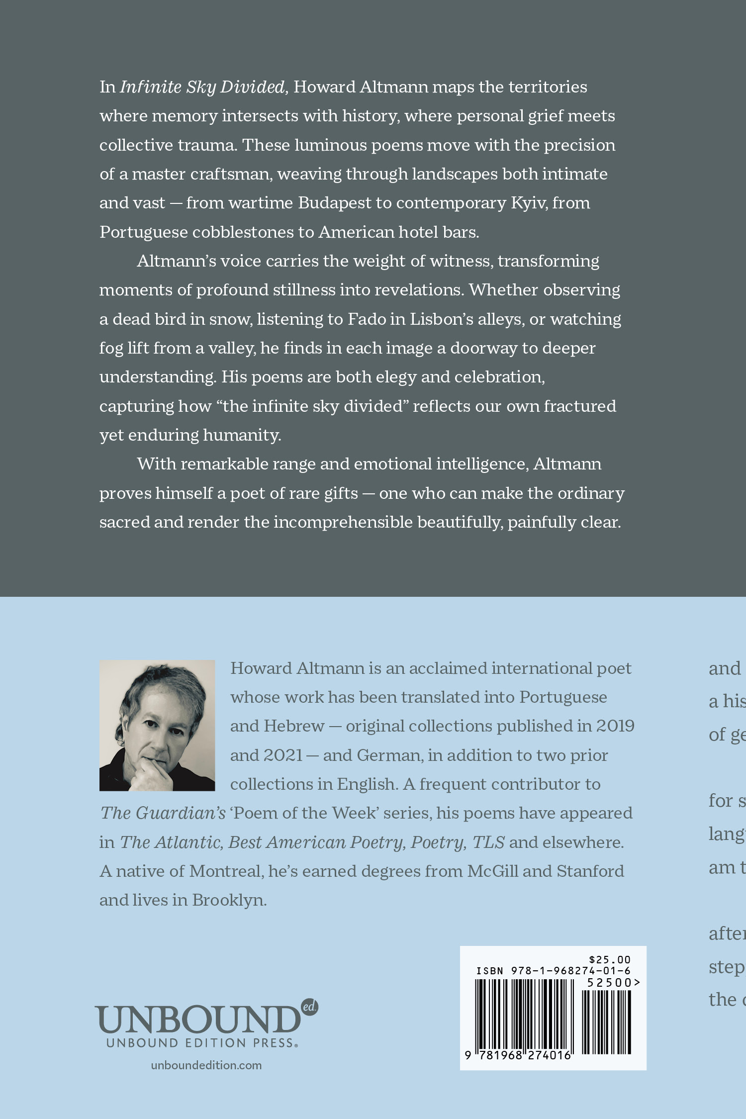 In Infinite Sky Divided, Howard Altmann maps the territories where memory intersects with history, where personal grief meets collective trauma. These luminous poems move with the precision of a master craftsman, weaving through landscapes both intimate and vast — from wartime Budapest to contemporary Kyiv, from Portuguese cobblestones to American hotel bars.