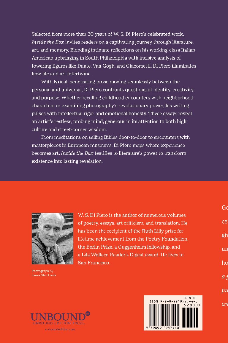 Inside the Box presents the record of a life lived in search of, and to honor, meaning. The essays, selected from more than 30 years of celebrated work, invite readers on a captivating journey through literature, art, and the landscape of memory. Blending personal reflections on his Italian-American upbringing with incisive analysis of figures like Dante, Van Gogh, and Coleridge, Di Piero illuminates the complex ways in which life and art intertwine. His lyrical, penetrating prose brings readers along as he confronts intricate questions of identity, creativity, desire, and purpose.